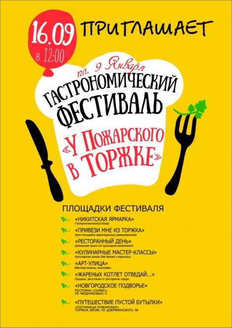 Приглашаем на фестиваль, где можно будет попробовать любимые блюда известных русских писателей, поэтов и путешественников, чьи имена так или иначе связанны с Торжком. Оценить прославленную А.С. Пушкиным Пожарскую котлету и попробовать себя в роли ресторатора, открыв, на один день, свой ресторан. Привезти в подарок из Торжка искусные изделия новоторжских мастеров!